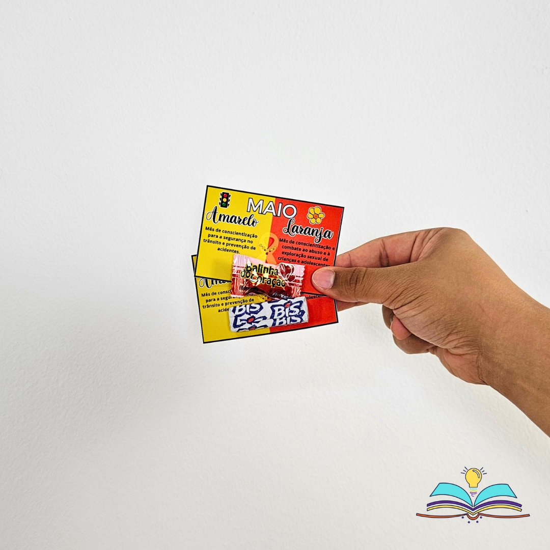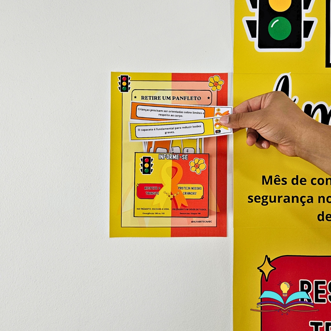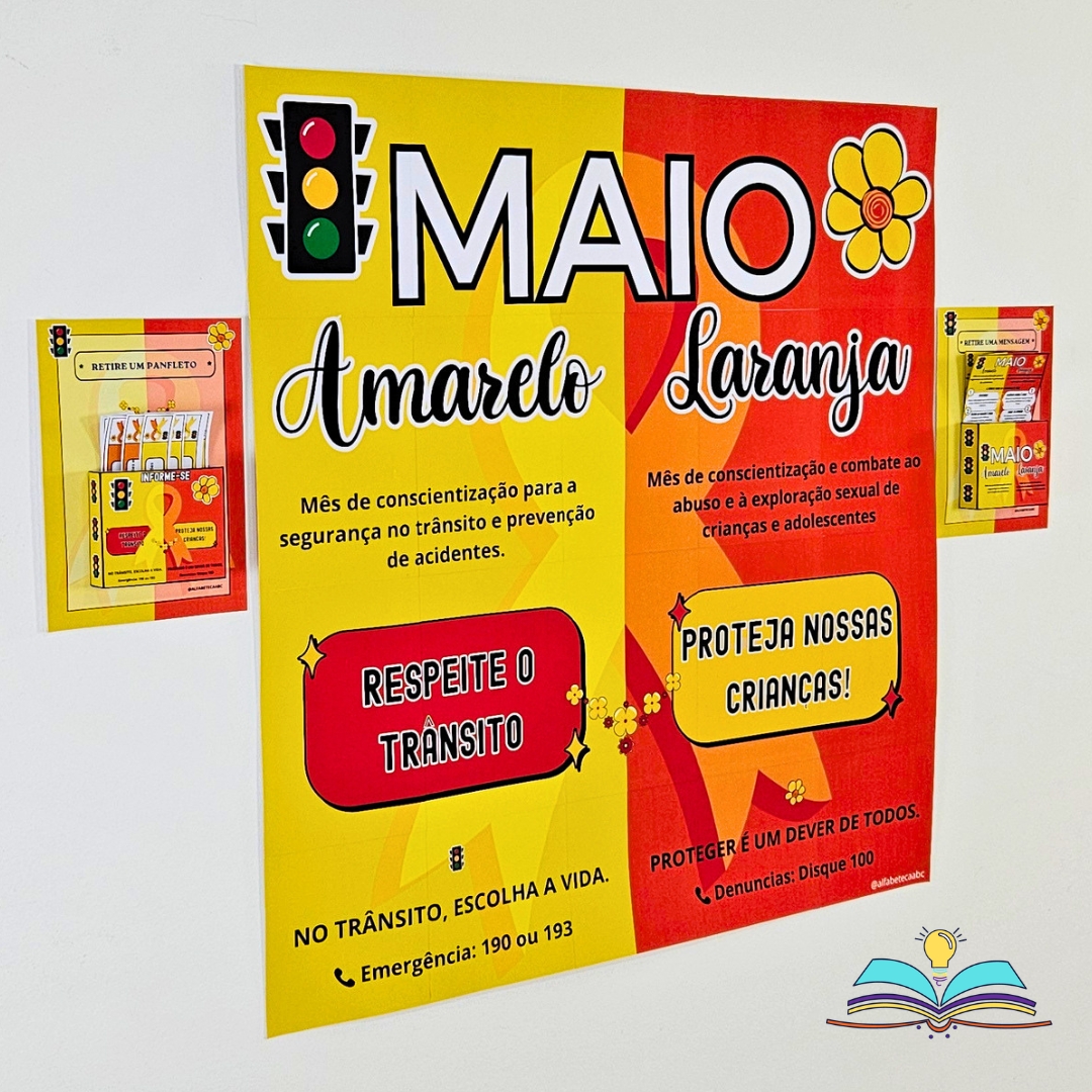 🔸Painel com o tema Maio Laranja e Maio Amarelo (segurança no trânsito responsável).